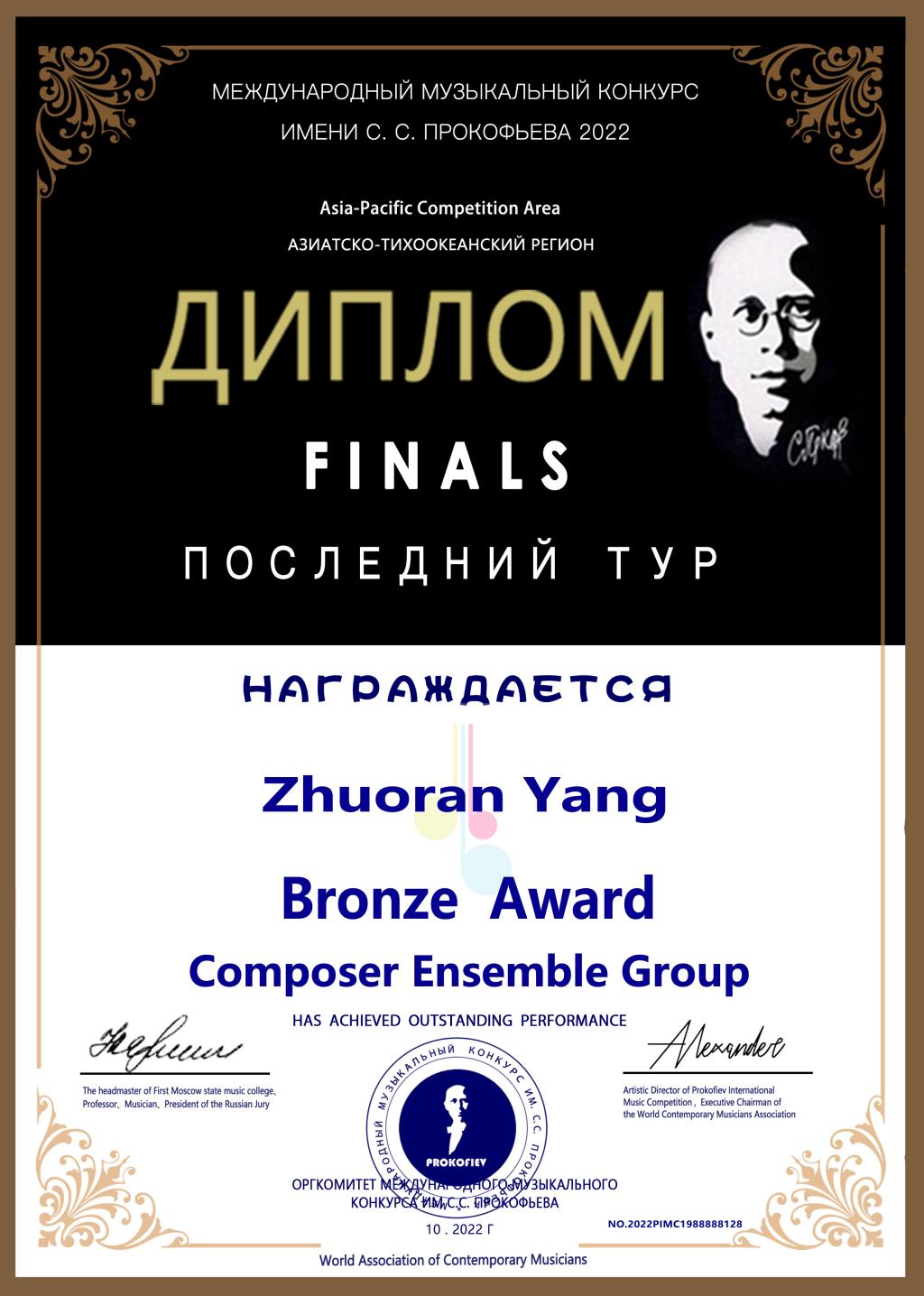 日前,在刚刚落下帷幕的2022普罗科菲耶夫国际音乐比赛亚太赛区决赛作曲项目中,我院作曲系2018级本科学生杨卓然(指导教师:张兆宇)凭借合唱作品《Who am I》和铜管五重奏作品《Insides》获得铜奖(金奖空缺),同时获得参加国际决赛资格。