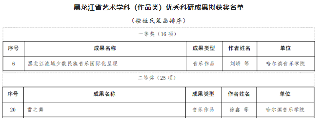 12月29日,黑龙江省社会科学界联合会公布了2022年黑龙江省艺术学科优秀科研成果奖评审结果。学院首次参与省艺术学科优秀科研成果奖评审,共获13项奖项。其中,理论类艺术学科优秀科研成果一等奖3项,二等奖7项,三等奖1项;作品类艺术学科优秀科研成果一等奖1项,二等奖1项。从获奖数量看,我院位居全省第三位。