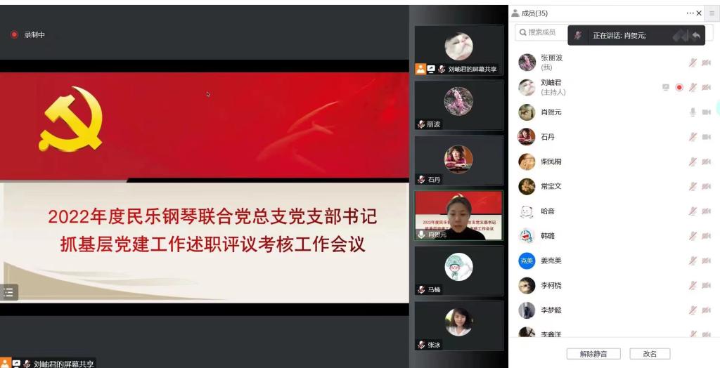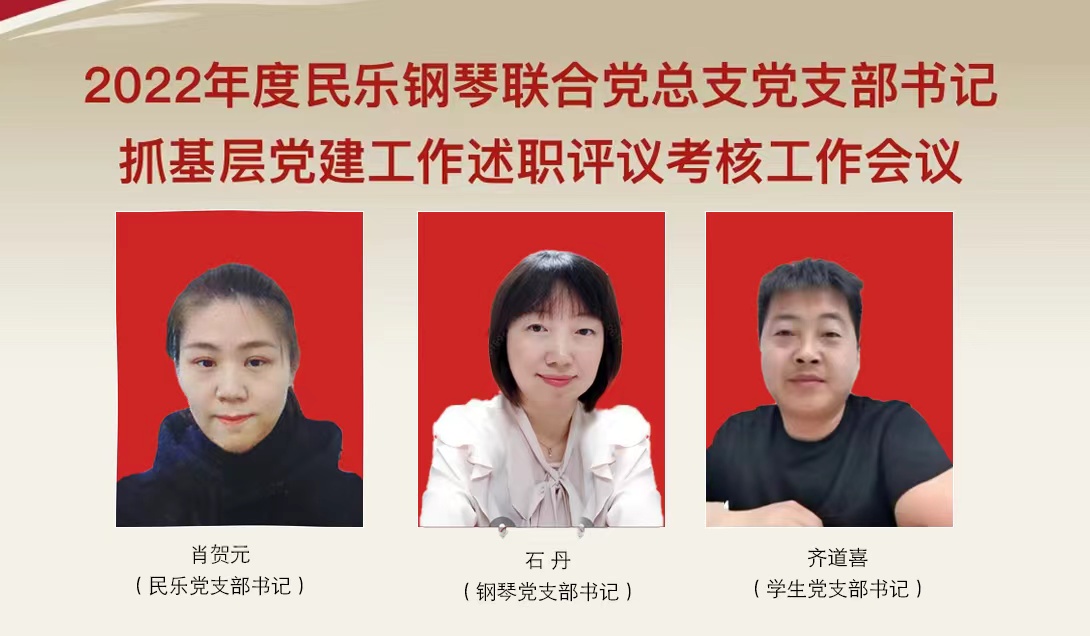 为切实落实党支部书记履行基层党建第一责任人职责,提升党支部工作水平,按照学院党委组织部《关于开展2022年度党组织书记抓基层党建述职评议考核的工作方案》(哈音组发〔2022〕23号)文件要求,民乐钢琴联合党总支于2022年12月31日召开2022年度党支部书记述职评议考核线上工作会议。党委班子党建联系点领导纪委书记、党委委员张丽波,党委委员、组织部部长马楠出席会议,民乐系主任姜克美、钢琴系主任元杰、民乐系副主任索帅、民乐钢琴联合党总支委员、所辖各党支部书记、全体党员师生参加会议,会议由党总支书记张冰主持。