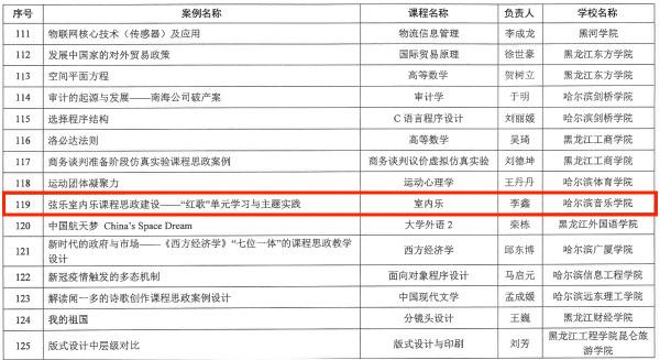 近日,省教育厅发布了《关于公布黑龙江高校第三批课程思政示范培育项目及首批课程思政优秀案例名单的通知》,我院钢琴系杨欣教授主讲的《钢琴A》,管弦系杨光教授主讲的《室内乐》,管弦系林岩教授主讲的《圆号(主科)》等3门课程荣获第三批课程思政示范课程和教学团队培育项目,管弦系李鑫副教授的《弦乐室内乐课程思政建设——“红歌”单元学习与主题实践》课程思政案例被评为首批黑龙江省高等学校课程思政优秀案例。