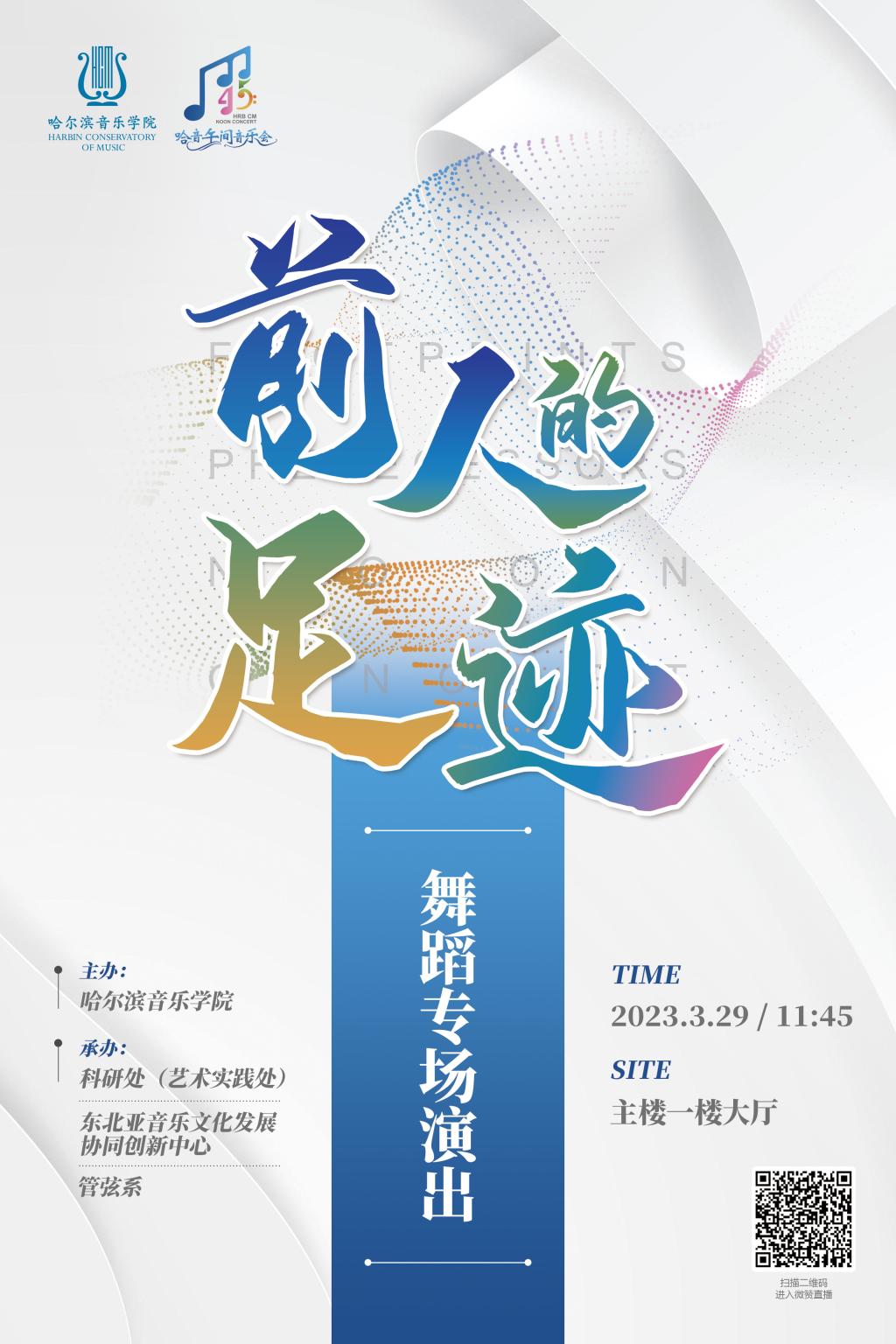 本学期场次安排本周节目预告:3月29日,哈音午间音乐会——“前人的足迹”舞蹈专场演出。