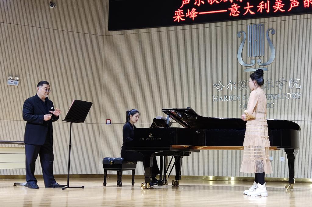 讲座上,栾峰教授举例说明了意大利语与中文在歌唱中不同发声方法、断气与吸气的区别,并结合自己的学习经历,建议同学们学习美声要追根溯源,正确地判断自己的声音类型,掌握科学的发声方法,演唱属于自己音域范围内的歌,发挥出自身最好的声音;要学习好意大利语,用意大利的歌曲来训练歌唱的发声方法、提高歌唱技巧。并举例说明了意大利语与中文在歌唱中不同发声方法、断气与吸气的区别。