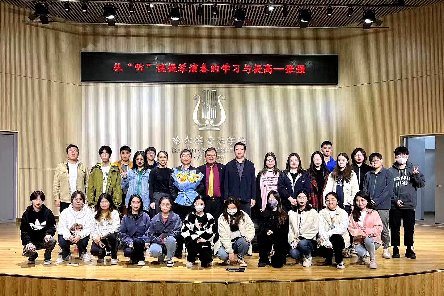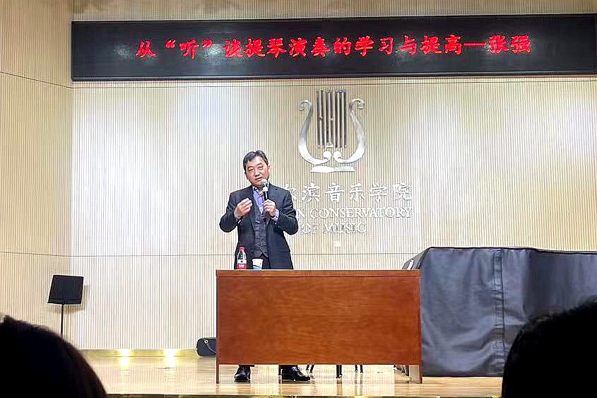 4月19日,学院邀请星海音乐学院小提琴教授、管弦系副主任,硕士生导师张强做客第二十期“哈音讲坛”在主楼204教室开讲,管弦系书记杨玲与学院师生现场参与。讲座由管弦系副主任杨光担任。