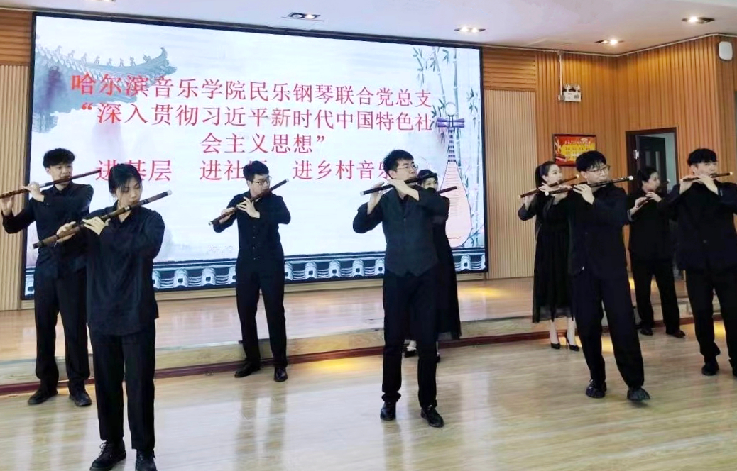 民乐钢琴联合党总支师生走进以培育留守儿童少年而全国闻名的松北区台屯小学校举办志愿服务演出。师生以小学生喜闻乐见的音乐表现形式,展现中国传统音乐的文化内涵和艺术魅力,收到热烈反响。
