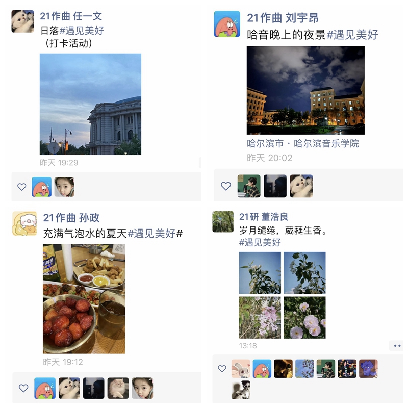 在朋友圈微感动打卡的过程中,同学们添加#遇见美好#标签,在朋友圈中发布图文记录生活,分享在生活中发现的美好事物。