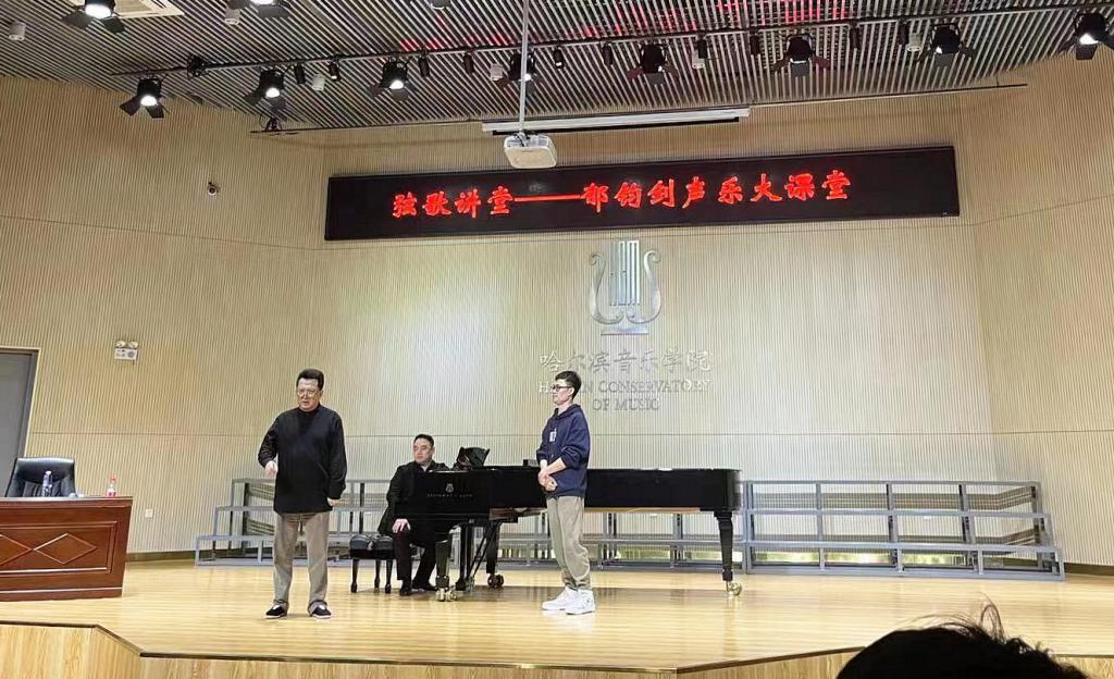课上,郁钧剑教授细致讲解了声带的七种功能,针对民族声乐演唱的基本技法做了详细分解,向学生演示咽音的基本功训练方法,带领现场师生进行了发声训练。他针对东北民歌讲解其独特之处,鼓励师生努力展现民歌真正的韵味与美感。