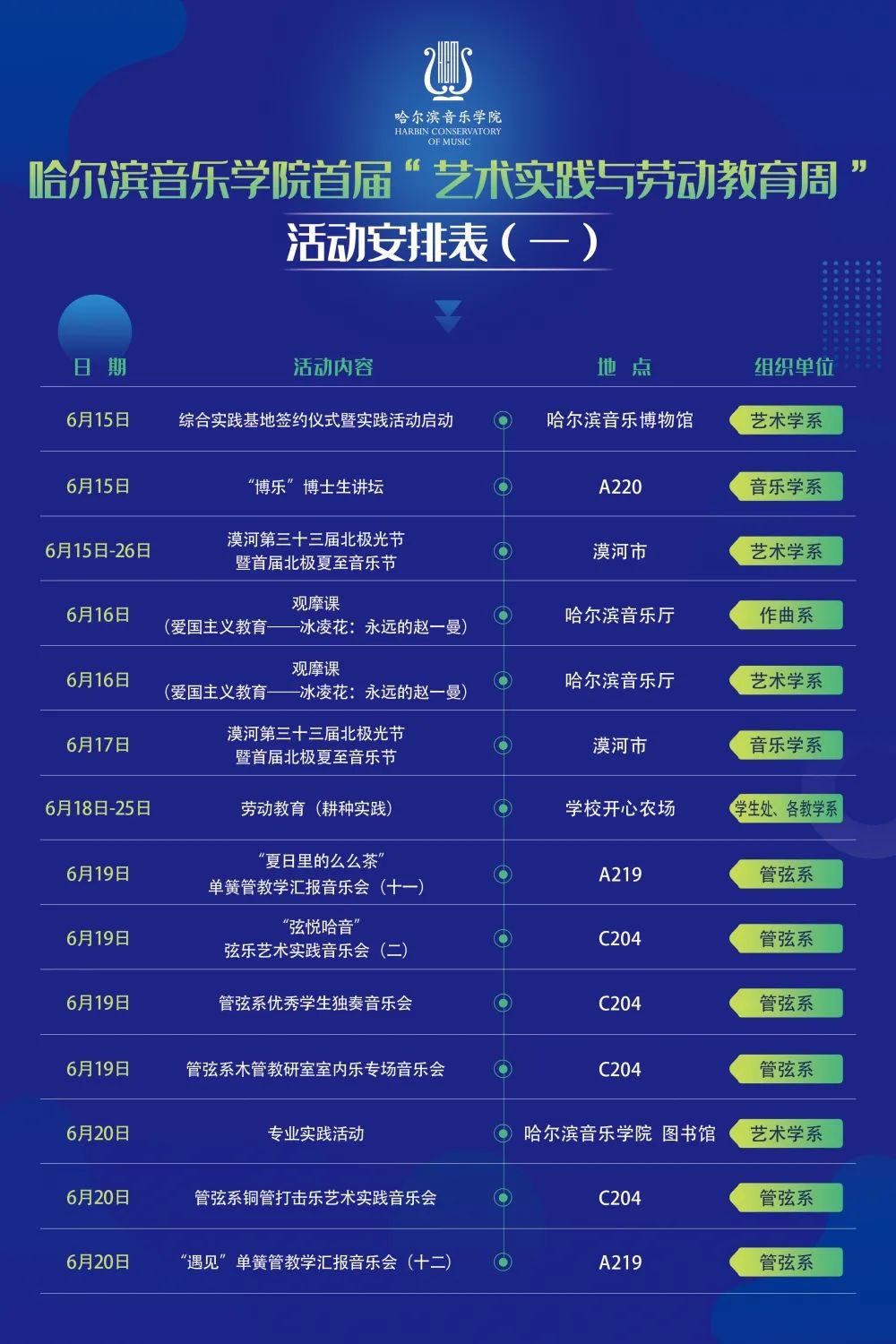 为深入落实学院“工作落实年”任务,加强“三优”人才培养和新文科建设,不断强化学生实践能力、创新能力和创新精神培养,逐步构建具有哈音特色的高水平实践育人体系,学院将于6月15日-6月27日开展首届“艺术实践与劳动教育周”活动。