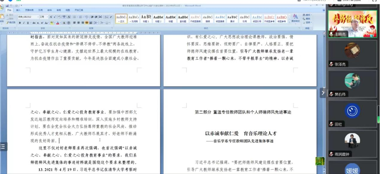 音乐学系党总支为深入贯彻学院党委关于暑期主题教育工作要求,保证“放假不停学、教育不断线”,围绕推进落实开展师德集中学习教育活动安排,结合近期开展的师德师风先进集体和先进个人申报工作,于8月11日下午以线上形式召开了系党总支“修师德、塑师风”理论学习中心组专题学习(扩大)会议,深入学习习近平总书记关于师德师风的重要论述,以及总结重温系专任教师团队的有益经验和感人事迹。音乐学系全体教职工参加会议,会议由系党总支书记王晓亮主持。会上,全体教职工集体学习了党的十八大以来习近平总书记对教育工作,特别是师德师风建设工作的重要论述和重要指示精神,其中既有总书记在多次教师节上的祝贺和慰问,也有数次深入高校调研考察重要指示,还有在全国教育大会和全国高校思想政治工作会议上的重要讲话,以及对黄大年等同志先进事迹作出的重要批示等,涵盖了13个时间节点或重大事件的重点内容,包括了引导广大教师明确“四有”好老师的目标,树立“三个牢固树立”和“四个引路人”的理念,加强师德师风建设“四个相统一”和“六个要”的要求等等,会议安排十分紧凑,学习内容非常丰富。