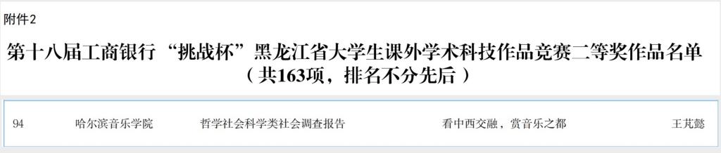 近日,由团省委、省教育厅等部门共同举办的第十八届工商银行“挑战杯”黑龙江省大学生课外学术科技作品竞赛结果揭晓,学院选送的作品获得一等奖1项、二等奖1项、三等奖1项。管弦系辅导员王鹏飞荣获“优秀指导教师”荣誉称号。