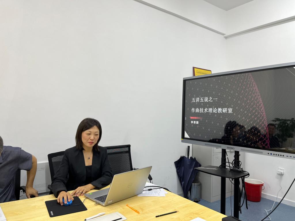 作曲技术理论教研室主任李思囡介绍了教研室落实学院、教学单位教学改革精神情况,教学团队建设,教研室活动,专业建设和人才培养模式改革,课堂教学方法与手段的改革与创新,课程、教材、教学项目建设与教学成果,实践工作开展、教学质量保障体系建构等内容。