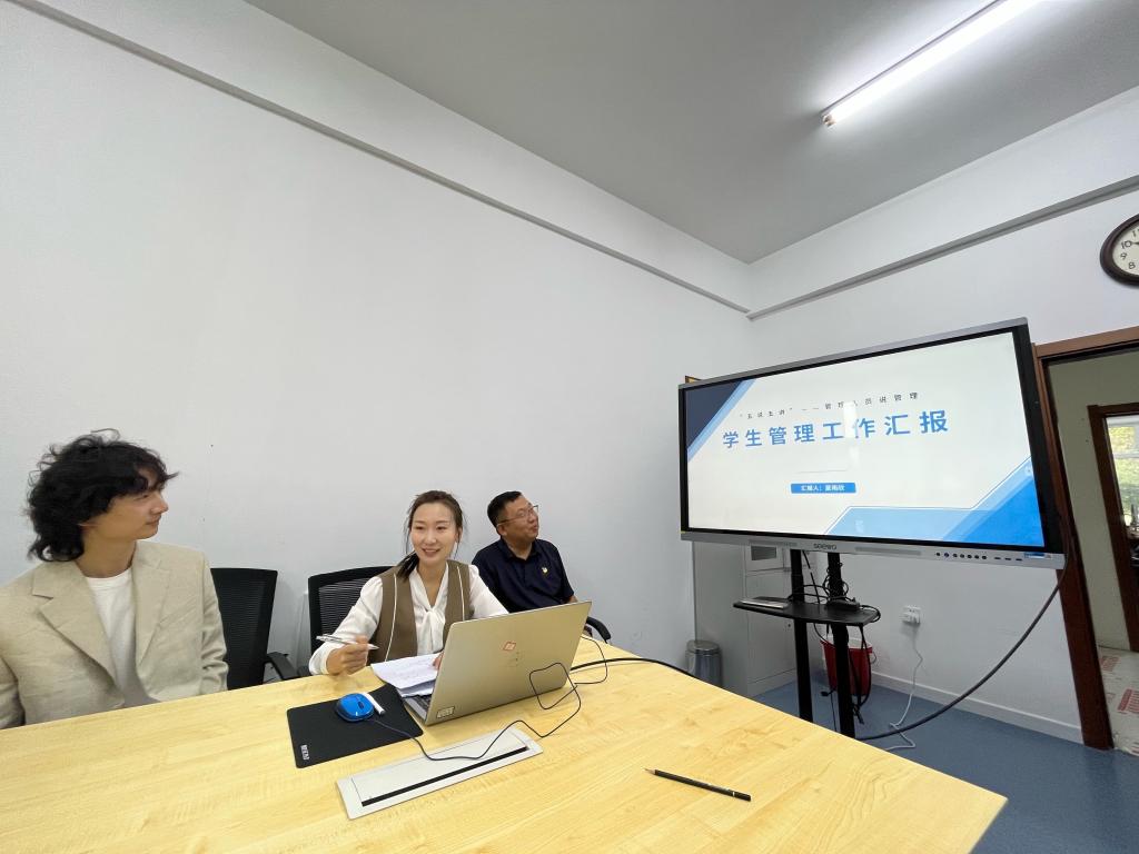 辅导员夏雨欣根据自身的工作内容,围绕资助服务、思政工作、心理健康、评奖评优、日常管理等几个方面向全系教师作汇报。