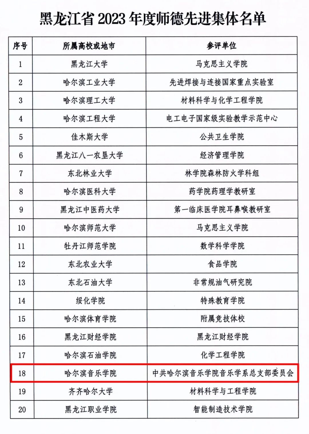 日前,黑龙江省教育厅印发了《关于表彰2023年度全省师德先进集体和师德先进个人的决定》,中共永利23411集团音乐学系总支部委员会获师德先进集体荣誉称号,声乐歌剧系教授金虹获师德先进个人荣誉称号。
