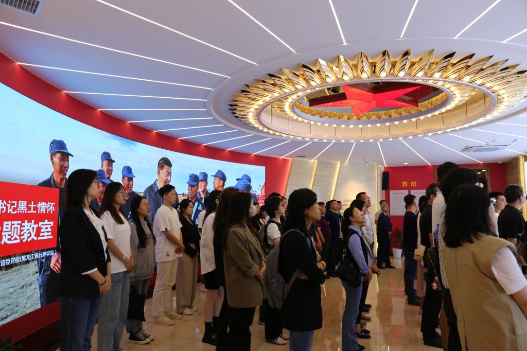 在讲解员的带领下,团员们依次走进“我的家乡黑龙江”“总书记黑土情怀”“龙江优秀精神情景”“红色家风”“中国共产党人精神谱系”五大特色主题教室,通过“声、光、电、景、影”相交汇的场景模式和“讲、听、读、演、唱”的多元教学方式相互融合,全面了解习近平总书记对龙江重要指示精神的演进脉络,领悟习近平新时代中国特色社会主义思想的丰富内涵。