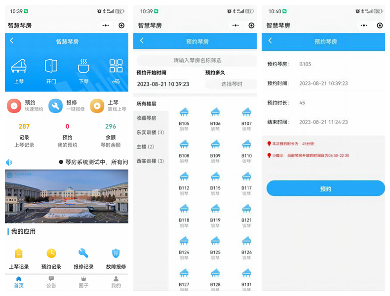 为贯彻落实立德树人根本任务,坚持“以人为本”,切实解决学生琴房使用紧张的问题,为学生提供更充分的艺术实践实训资源,经过近一年的部署、调试,学院智慧琴房管理系统正式上线使用啦!