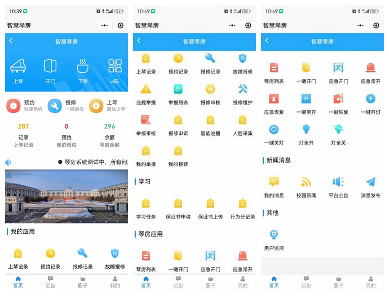Q:教师们的琴房功能有哪些呢?1.每间教师琴房都配备了21.5寸智能终端、湿度传感器、语音提示器、智能控电器等设备。2.在智能终端上可任意挑选三种方式进入琴房:扫描二维码、动态密码或人脸识别。3.课程表、教师简介、音乐会预告、讲座预告等信息,通通可以在智能终端上查看,可谓是一目了然~4.智能灯控,上琴电灯开关自动开启,结束练琴电灯自动关闭,既环保又方便。5.可通过微信小程序查看所有琴房的使用状态,提交故障报修单、通知公告查看等功能,再也不用担心错过重要信息啦!