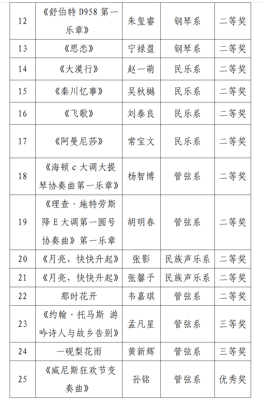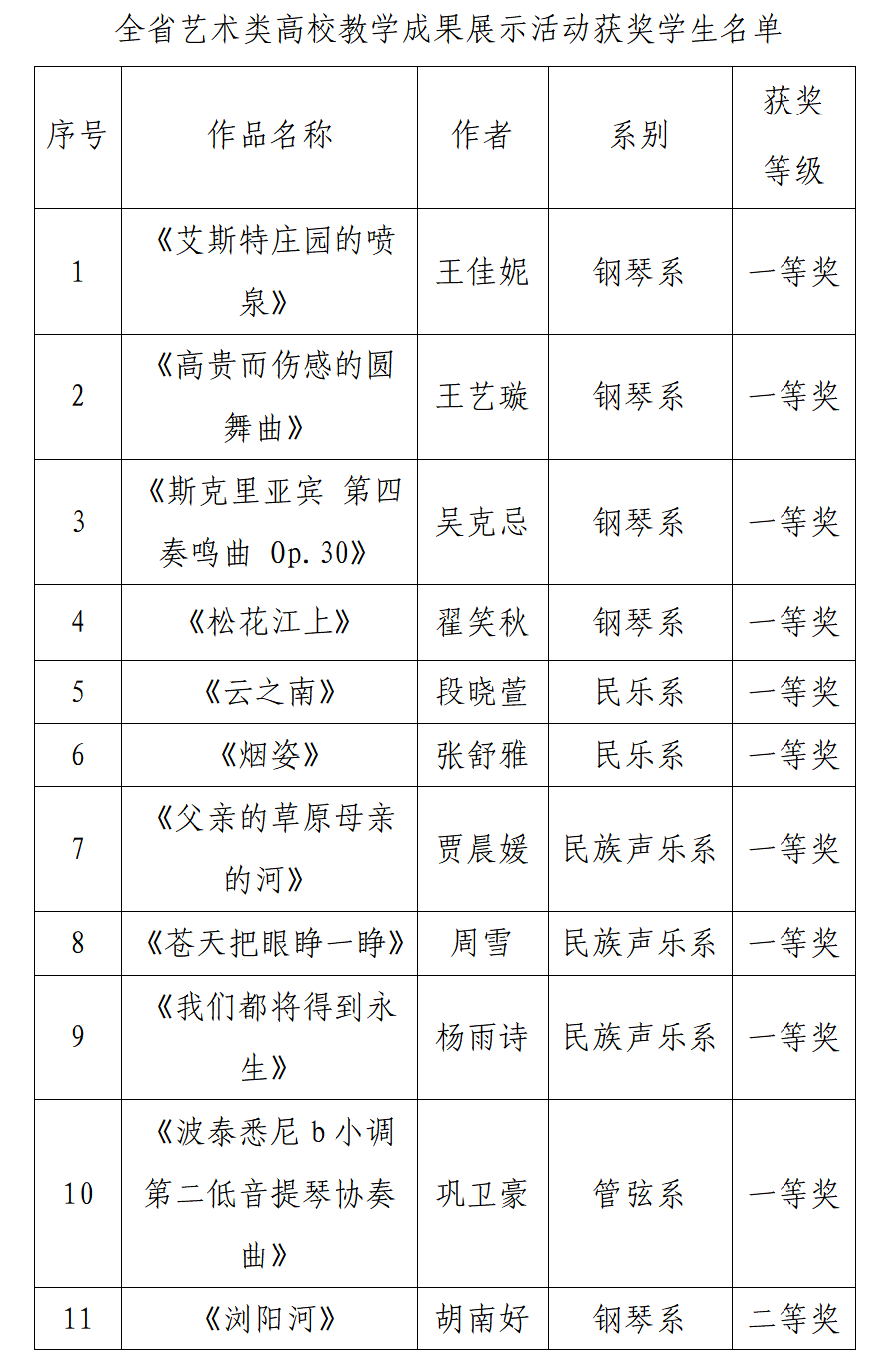 为进一步推动我省音乐艺术持续健康发展,发现和培养高水平音乐人才,近日,黑龙江省文化和旅游厅组织开展的第三届全省艺术类高校教学成果作品评选和展演成绩公布。在学院高度重视、积极动员,精心筹备下,推荐的声乐、器乐、舞蹈三大类共计32项作品全部获奖。其中教师获得一等奖4项、三等奖3项;学生获得一等奖10项、二等奖12项、三等奖2项、优秀奖1项。