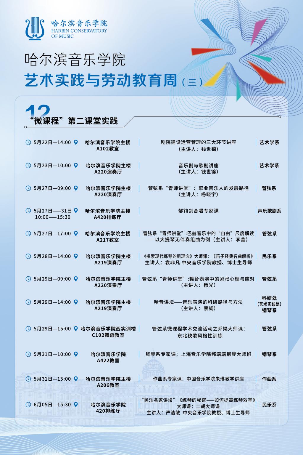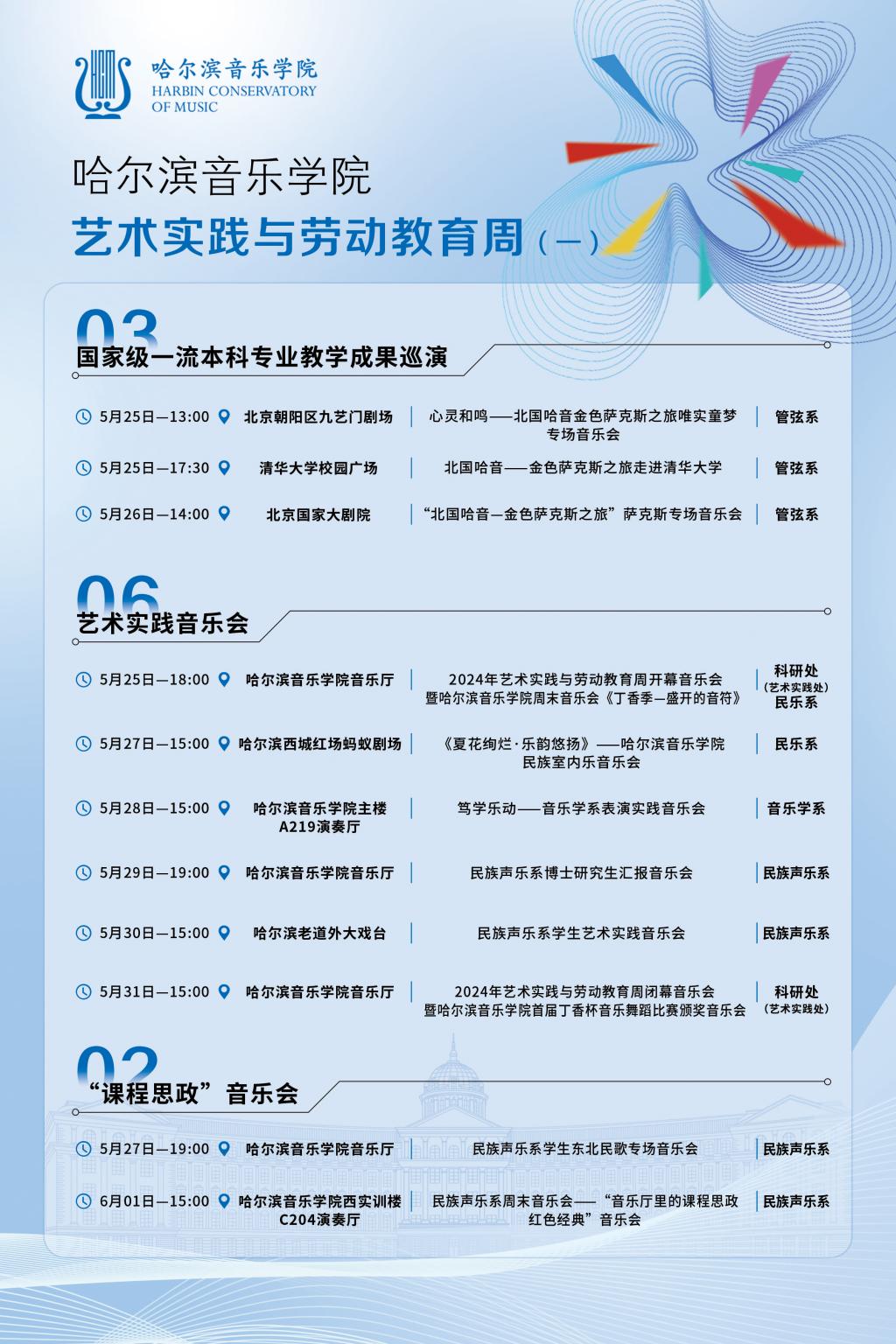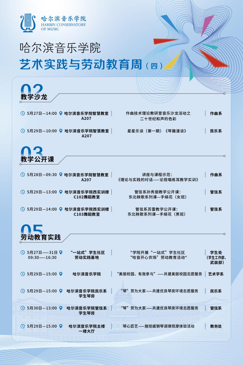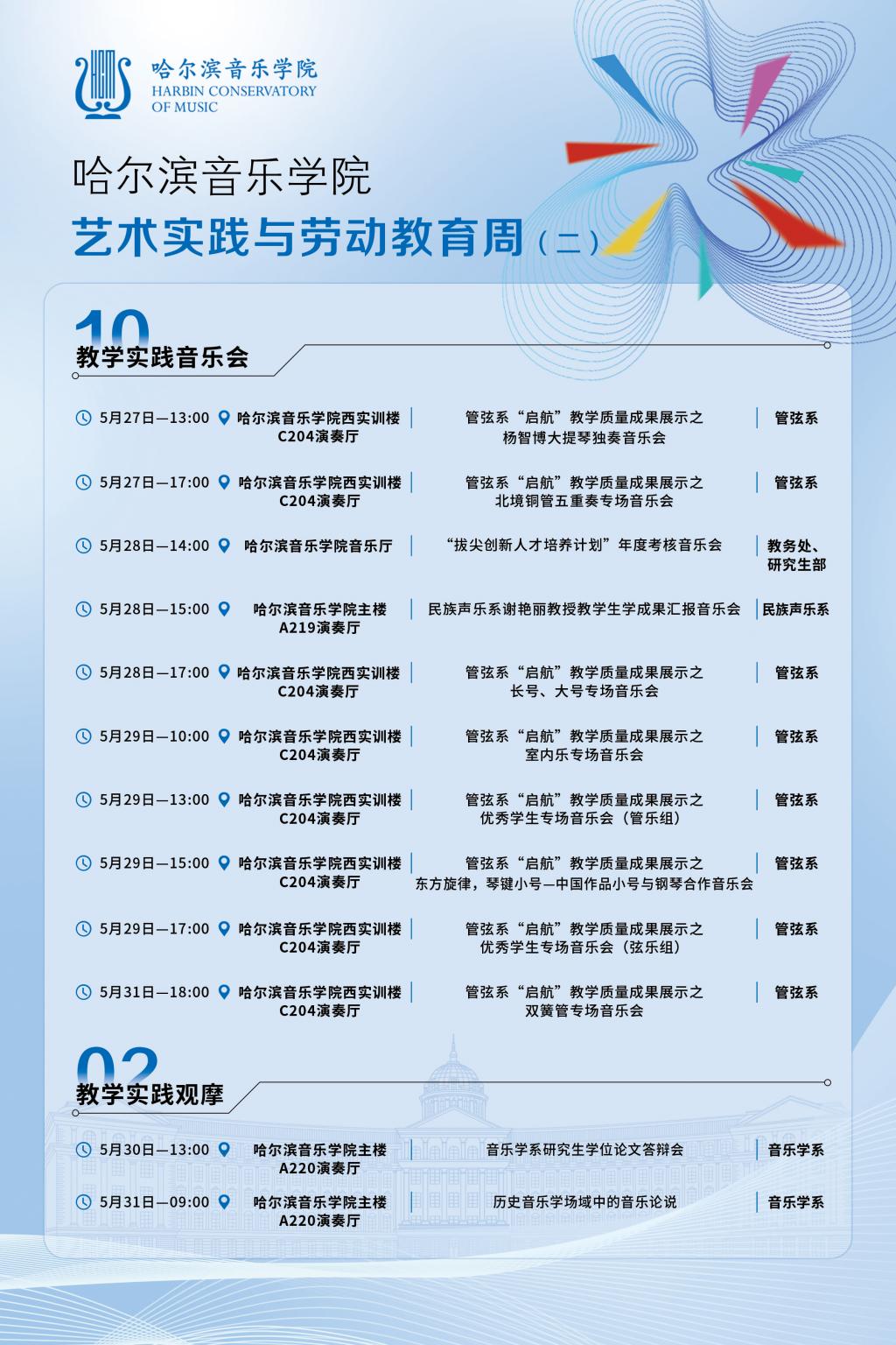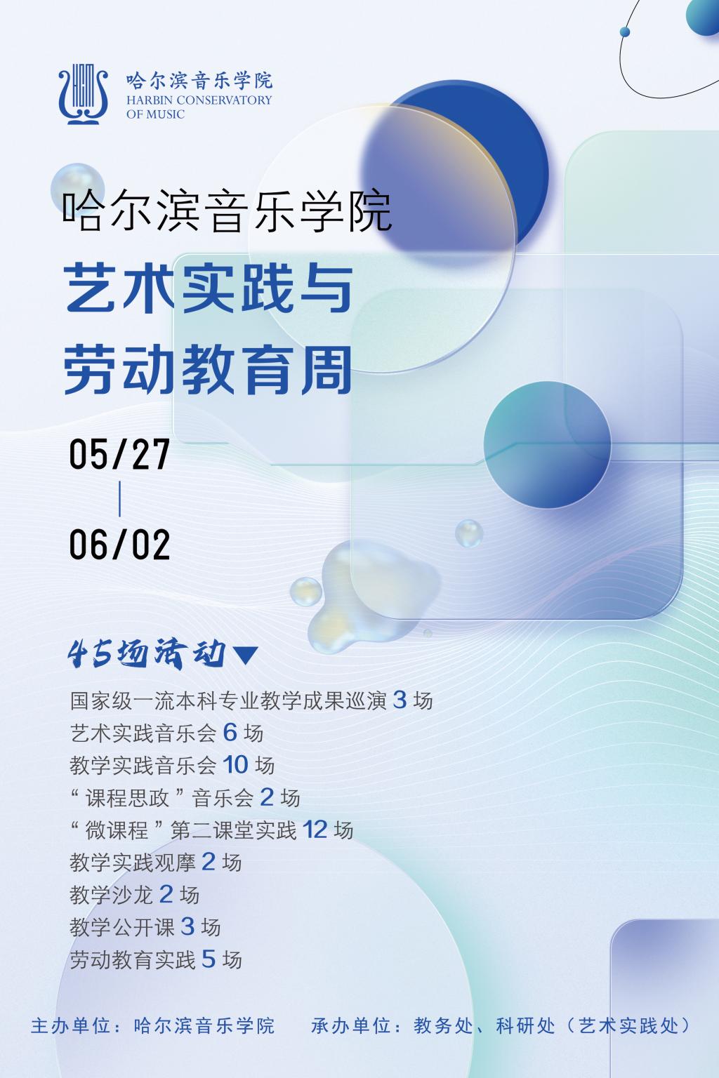 艺术实践与劳动教育周不仅是一场艺术的盛会,还是实践能力提升的平台,更是一次全面育人的活动,展示哈音学子专业风采的舞台。在这里,同学们可以感受到艺术的温度,触摸到美的脉搏。让我们一同沉浸在艺术的海洋中,感受美的力量和劳动的收获。