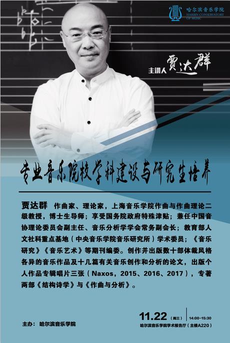 贾达群,作曲家、理论家,上海音乐学院作曲与作曲理论二级教授,博士生导师;享受国务院政府特殊津贴;兼任中国音协理论委员会副主任、音乐分析学学会常务副会长;教育部人文社科重点基地(中央音乐学院音乐研究所)学术委员;《音乐研究》《音乐艺术》等期刊编委。创作并出版数十部体裁风格各异的音乐作品及十几篇有关音乐创作和分析的论文,出版个人作品专辑唱片三张(Naxos,2015、2016、2017),专著两部《结构诗学》与《作曲与分析》。