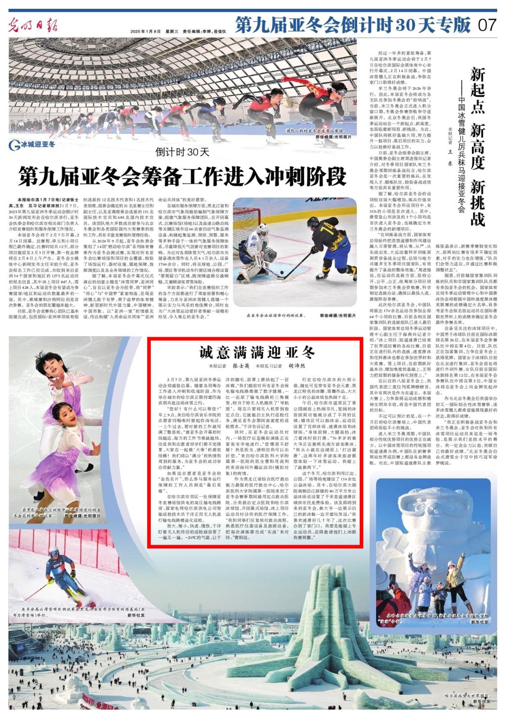 1月8日,《光明日报》第九届亚冬会倒计时30天专版报道学院青年志愿者深入践行志愿服务精神,积极投身服务亚冬会的行动,为第九届亚冬会的筹备和举行展现哈音青年力量。