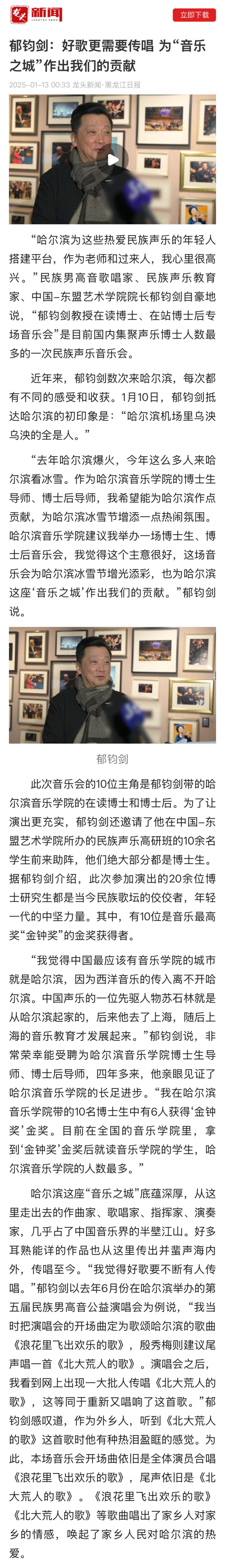 下一条:龙头新闻:燃情冰雪季|第41届中国·哈尔滨国际冰雪节“弘扬民族美 放歌新时代”郁钧剑教授在读博士、在站博士后专场音乐会激情开唱