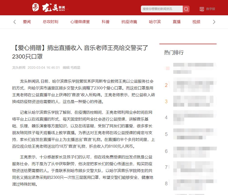 龙头新闻:捐出直播收入 音乐老师王亮给交警买了2300只口罩