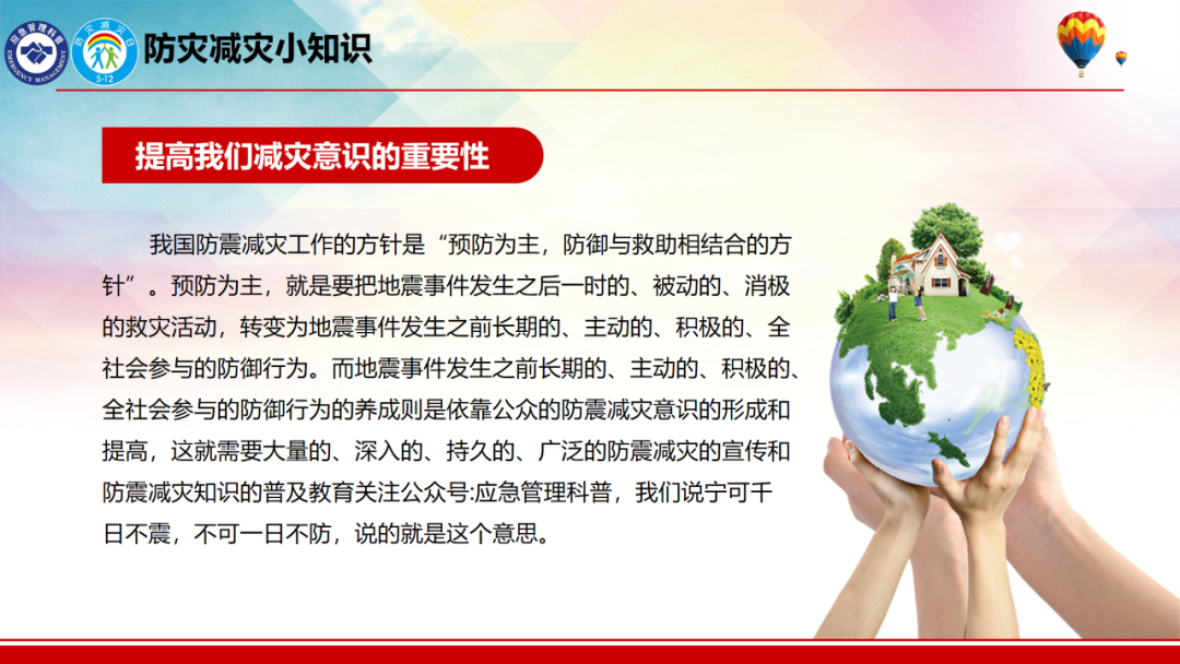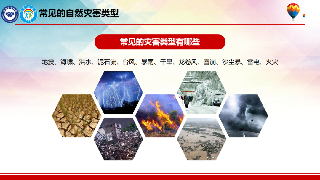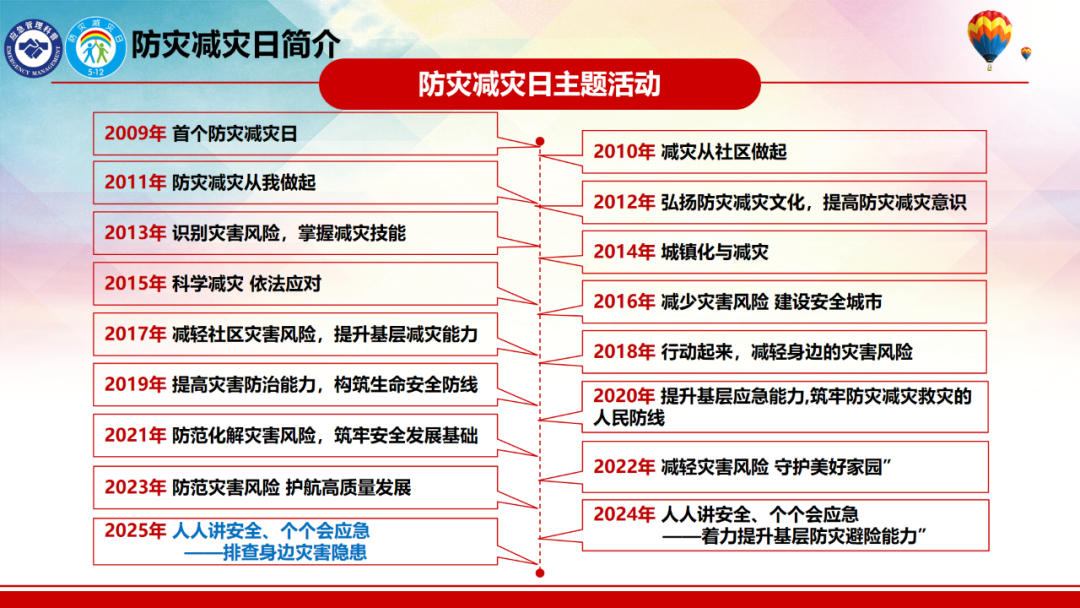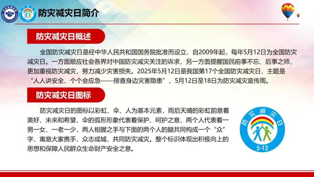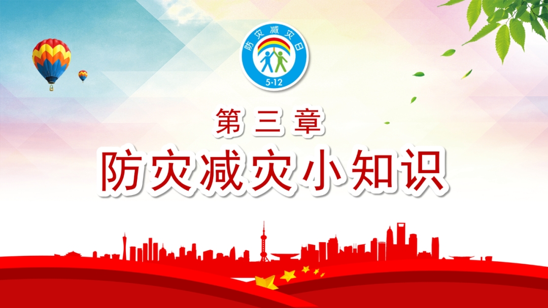 今年5月12日是我国第17个全国防灾减灾日,主题是“人人讲安全、个个会应急——排查身边灾害隐患”。5月12日至18日为防灾减灾宣传周。