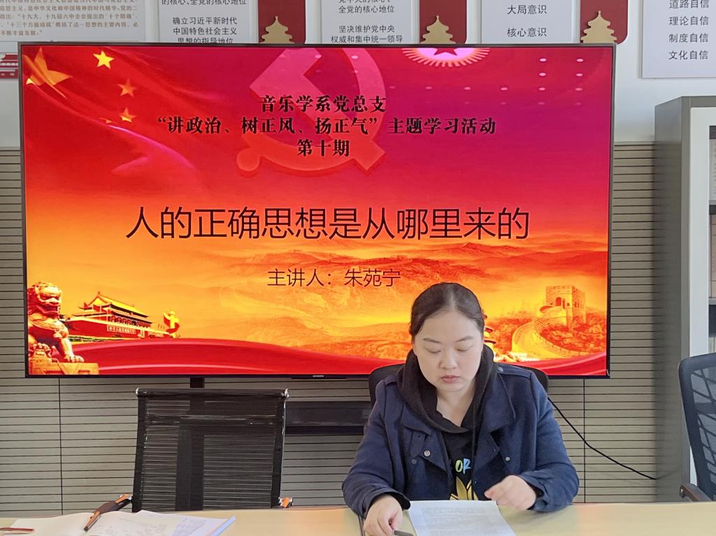 为深入学习贯彻党的二十大和二十届三中全会精神,进一步提高政治站位,统一思想认识,落实立德树人根本任务,10月9日下午,音乐学系党总支在主楼A427室举办了“讲政治、树正风、扬正气”主题学习第十期活动,音乐学系全体教职工参加,西方音乐史教研室教师朱苑宁作专题发言。